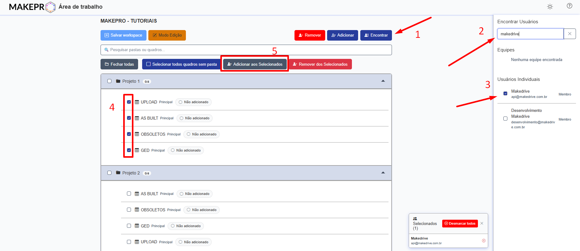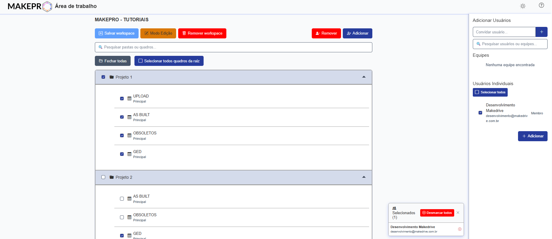 Antes de adicionar usuários aos projetos, os usuários devem primeiramente serem adicionados à Área de trabalho em questão, somente dessa forma eles irão aparecer na listagem e poderão ser adicionados às pastas e projetos