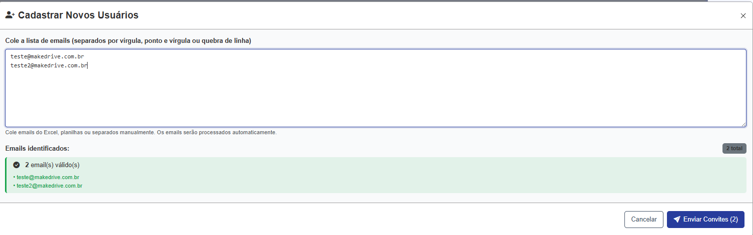 - Adicione os e-mails (separados por vírgula ou linha)
