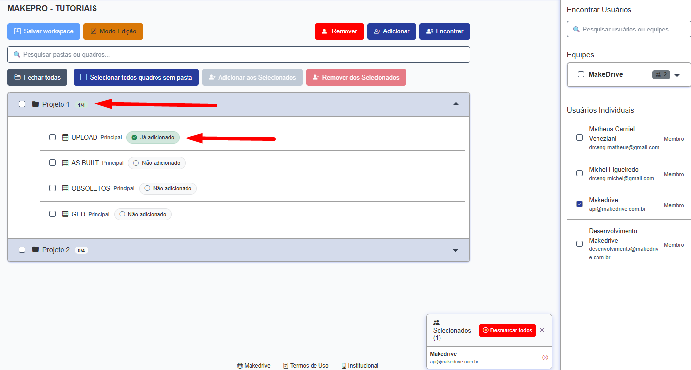 - Checkbox verde "Já adicionado": aparece quando o usuário está presente em todos os quadros visíveis da pasta